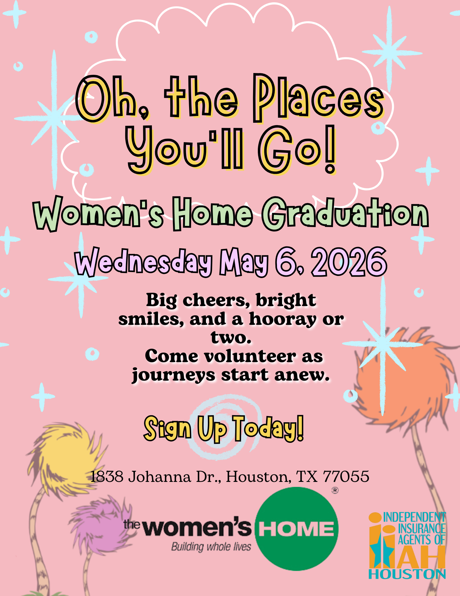 ORGANIZATION’S NAME: The Women's Home VOLUNTEER DATE: May 06, 2026 TIME: 4:00 PM - 8:00 PM LOCATION: Mabee Whole Life Service Center 1905 Jacquelyn Drive Houston, TX 77055 VOLUNTEER ACTIVITY: Our group will be hosting a graduation for the women completing the program and celebrate women receiving achievement awards. Our volunteers will help decorate, set up, serve dinner/dessert and clean up after the event. Free parking is located at 1838 Johanna Drive. IIAH will provide the following: - Decorations for 20 tables (plastic tablecloths and centerpieces)