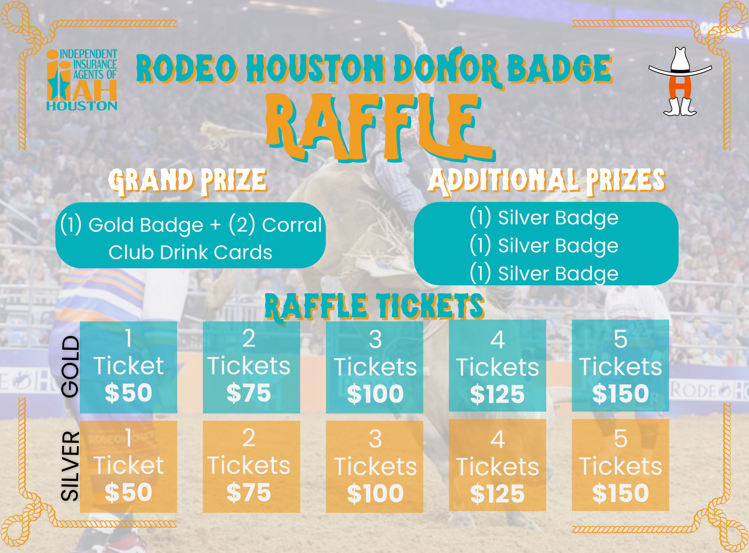 ►(GRAND PRIZE): Gold Badge allows access for the badge holder and a guest to all 2026 Show events throughout NRG Park, entry into Corral Clubs, and access to the main concourse of NRG Stadium for RODEOHOUSTON® performances. The Gold Badge does not guarantee a seat in NRG Stadium or allow access to the club or suite levels in the Stadium. (2) Corral Club Drink Cards: Drink card is loaded with 10 drinks on each card to be used in the Corral Club Locations ►Silver badge allows access for the badge holder and a guest to all 2025 Show events in the NRG Center and NRG Arena. Does NOT give access to NRG Stadium, into any Corral Club, or Rodeo Uncorked! Shelby Hibbard | shibbard@iiah.org | 832.769.5247